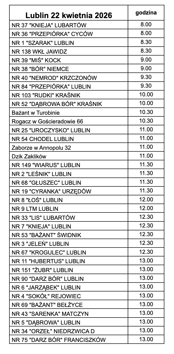 Na wniosek Przewodniczącego Komisji Oceny Prawidłowości Odstrzału Samców Zwierzyny Płowej i Wyceny Trofeów w Lublinie, Zarząd Okręgowy Polskiego Związku Łowieckiego zawiadamia, iż ocena i wycena jeleni byków oraz danieli odbędzie się w dniach 21-22 kwietnia 2026 roku.
